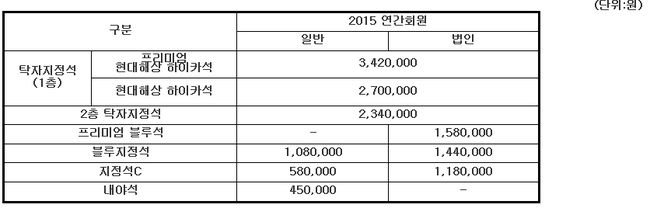 판매가격은 프리미엄 현대해상 하이카석 342만원, 현대해상 하이카석 270만원, 2층 탁자지정석 234만원, 블루석 108만원, 지정석C 58만원, 내야석 45만원이다.