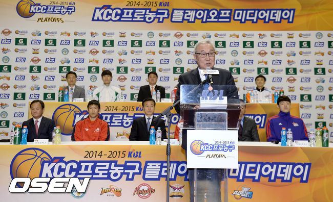 감독과 선수들이 자리한 가운데 김영기 KBL 총재가 인삿말을 전하고 있다.