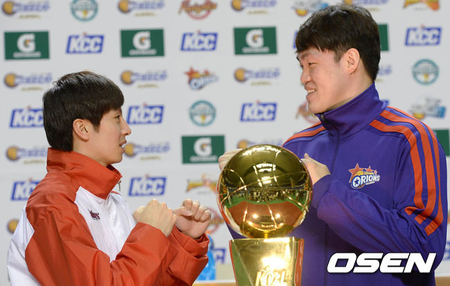 오리온스 이승현과 LG 김시래가 포토타임을 갖고 있다.