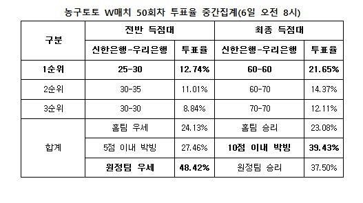 2014-2015시즌 농구토토 W매치 50회차 투표율 중간집계 결과…10점차 이내 접전 전망