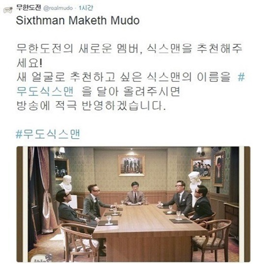 지난 5일 ‘무한도전’ 공식 트위터에는 “Sixman maketh mudo 무한도전의 새로운 멤버. 식스맨을 추천해주세요. 새 얼굴로 추천하고 싶은 식스맨의 이름을 #무한도전식스맨을 달아 올려주시면 방송에 적극 방영하겠습니다”라는 글과 사진을 게재했다.