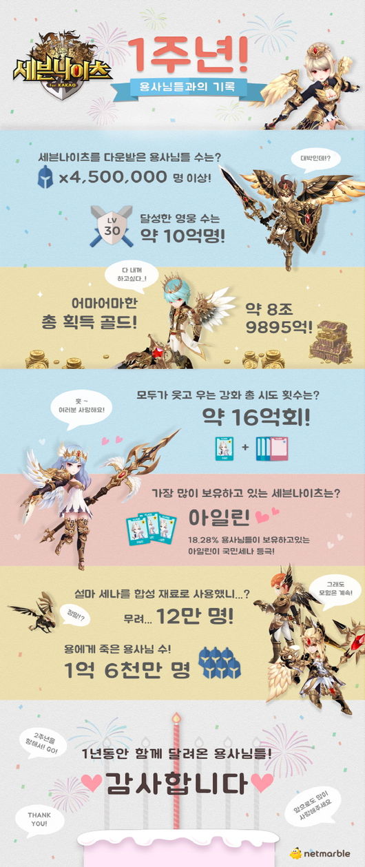 또 이용자들이 레이드에 참여해 패배한 수는 약 1억 6000만 번, ‘세븐나이츠’의 주인공인 7명의 영웅을 합성 재료로 사용한 안타까운 이용자는 약 12만 명 등의 흥미로운 기록도 남겼다.