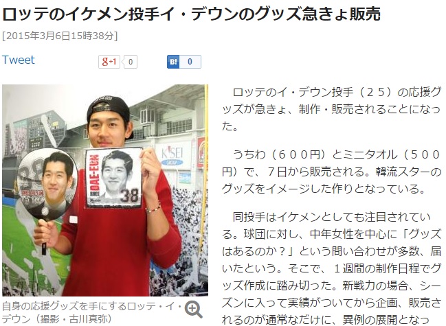 일본 '닛칸스포츠'는 6일 지바 롯데의 미남 투수 이대은을 위한 응원 상품이 긴급 제작돼 판매된다고 보도했다. 600엔 부채와 500엔 미니 수건이 7일부터 판매가 시작된다.