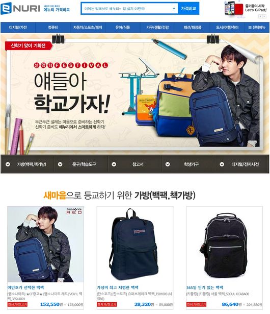 '신학기 필수 아이템 추천' 코너는 가방(백팩, 책가방), 문구/학습도구, 참고서 등 신학기 시즌 학생들이 가장 많이 찾는 제품들로 기획됐다. '이민호 백팩'으로 잘 알려진 쌤소나이트 레드 VOY L은 최저가 15만 원 대부터 구입 가능하고, 그 외 각종 백팩 제품을 최저 2만 원 대부터 구입할 수 있다.