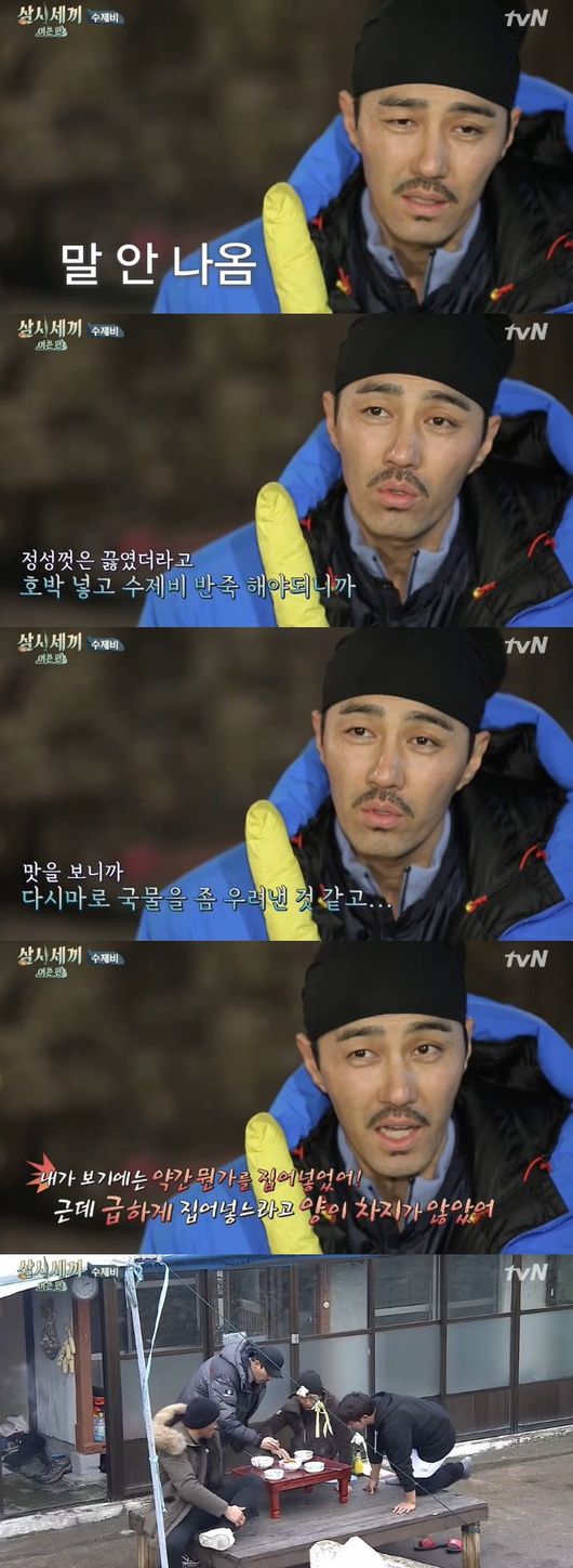 식사 후 차승원은 '맛이 어땠느냐'는 제작진의 질문에 잠시 머뭇거리더니 "정성껏은 끓였더라고. 호박 넣고 수제비 반죽 해야되니까. 맛을 보니까 다시다로 국물을 좀 우래년 것 같다"고 유해진의 요리에 대한 노력과 정성에 점수를 줬다.