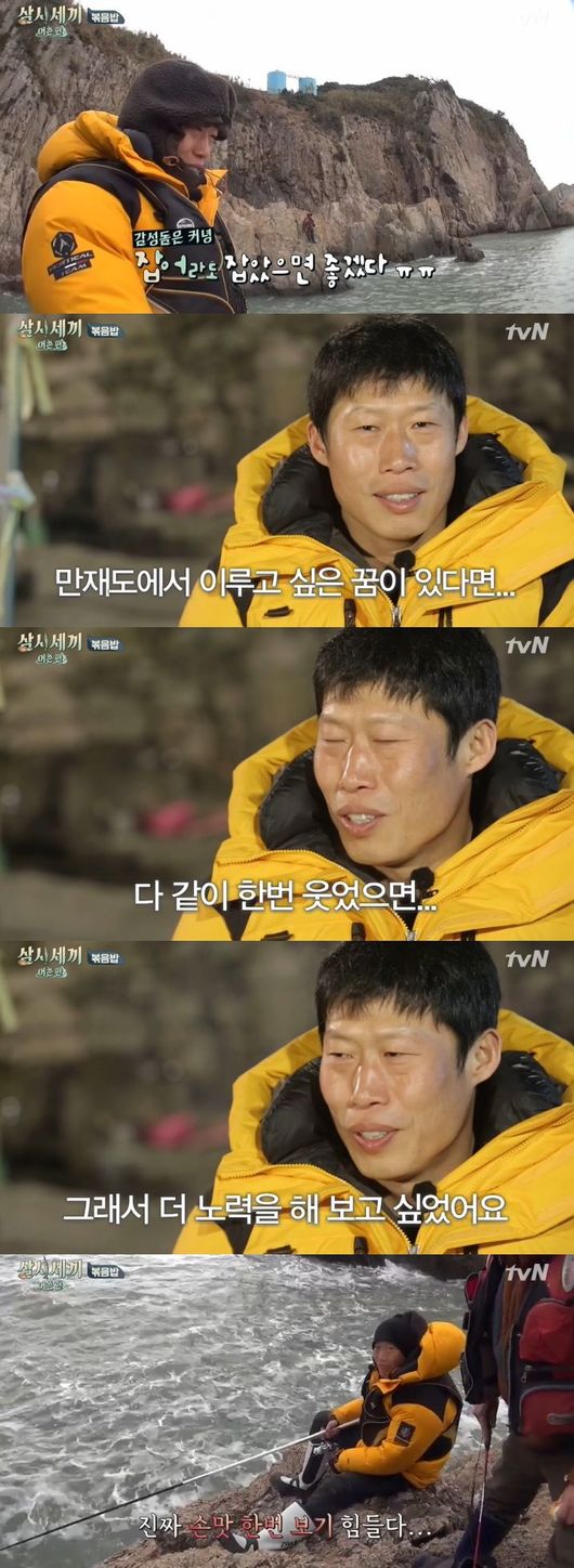 수제비를, 제육볶음을, 그리고 볶음밥을 맛있게 먹으면서도 유해진은 유독 낚시에 집착했다. 바로 처음부터 시도했던 감성돔 낚시에 성공하고 싶다는 일념 때문에다.