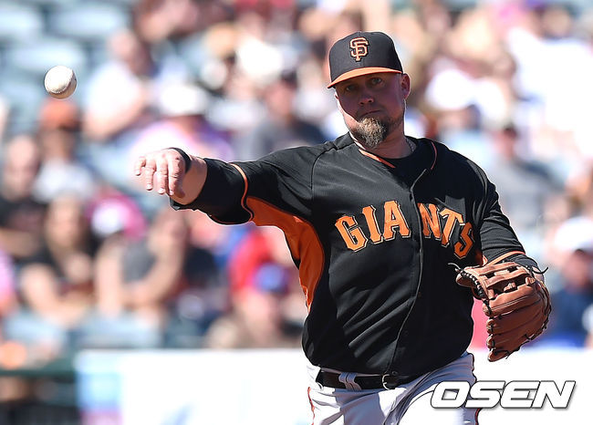 샌프란시스코 케이시 맥기가 송구를 하고 있다.