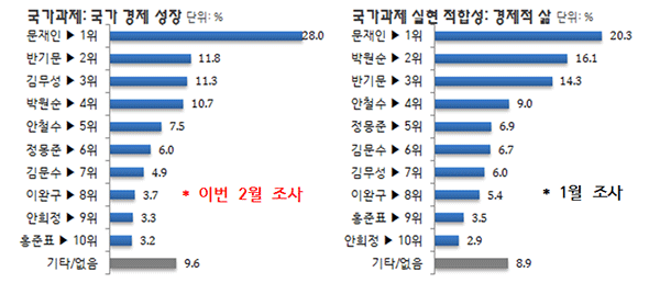 저소득층을 비롯한 국민들을 골고루 잘 살 수 있게 하는 데 가장 적절한 차기 대통령을 묻는 질문에서도 문 대표가 전월 대비 5.6%p 상승한 24.8%로 박원순 서울시장을 제치고 1위로 올라섰다.