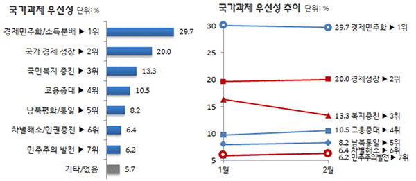 그 결과 국민들은 '차기 대통령이 최우선으로 해결해야 할 국가과제'로 '경제민주화와 소득재분배'를 가장 많이 꼽았다. 지난 1월부터 매월 실시하고 있는 리얼미터 정례 2월 '국가과제 분야별 대선주자 적합도 조사'에서 차기 대통령이 다음 중 어느 국가과제를 최우선적으로 해결해야 한다고 생각하는지에 대해 물은 결과, '경제민주화·소득재분배'가 29.7%로 1위에 선정됐다.