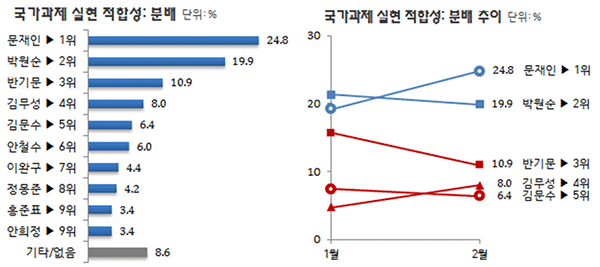 국가과제별로 적절한 차기 대통령을 먼저 질문한 후, 전반적으로 차기 대통령으로 누가 가장 적합한지에 대해 물어본 결과에서도 문 대표는 전월 대비 7.5%p 상승한 32.3%로 30%대로 올라서며 2개월 연속 1위를 이어갔다.