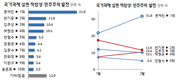 민주주의를 발전시키는 데 가장 적절한 차기 대통령을 묻는 질문 역시 문 대표가 전월 대비 10.1%p 상승한 31.8%로 30%대로 올라서며 2개월 연속 1위를 이어갔다.