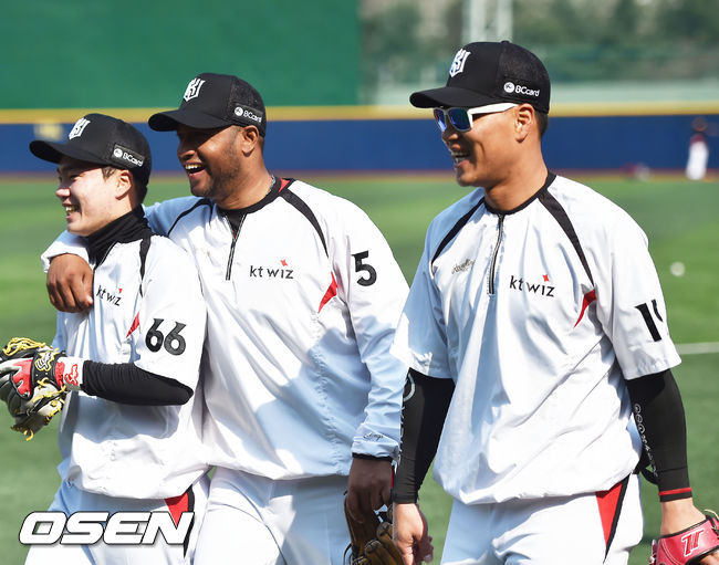 7일 오후 서울 목동구장에서 ‘2015 타이어뱅크 KBO 리그’ 시범경기 넥센 히어로즈와 kt 위즈의 개막전이 열릴 예정인 가운데 오전 양 팀 훈련 시간에 kt 김선민 마르테 김상현이 환하게 미소짓고 있다.
