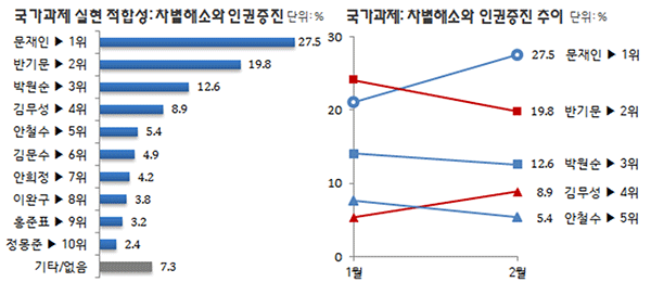 문 대표는 계층간 차별을 해소하고 인권을 증진시키는데 가장 적절한 차기 대통령을 묻는 질문에서도 전월 대비 6.4%p 상승한 27.5%로 반기문 UN사무총장을 제치고 1위로 올라섰다. 반 UN사무총장은 19.8%로 4.3%p 하락해 2위로 내려갔다.