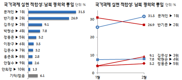 남북의 평화와 통일을 도모하는 데 가장 적절한 차기 대통령을 묻는 질문도 문 대표가 전월 대비 5.9%p 상승한 31.5%로 반기문 UN사무총장을 제치고 1위로 올라섰다.