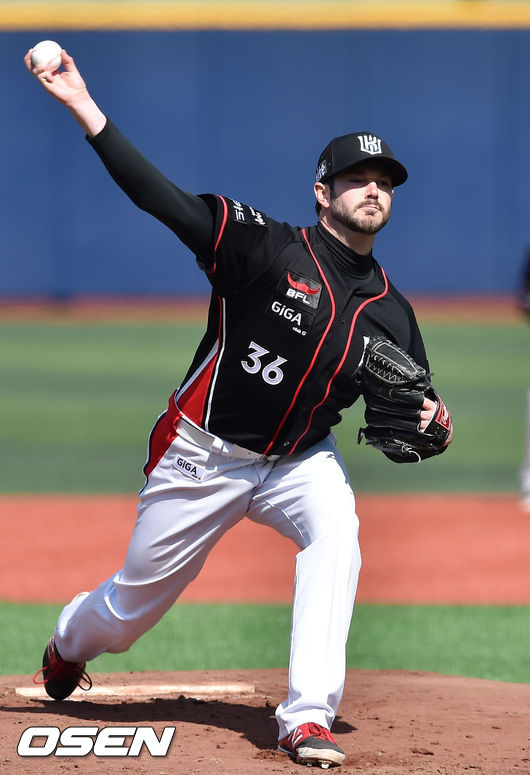 7일 오후 서울 목동구장에서 ‘2015 타이어뱅크 KBO 리그’ 시범경기 넥센 히어로즈와 kt 위즈의 개막전이 열렸다. kt 선발 필 어윈이 힘차게 공을 뿌리고 있다.