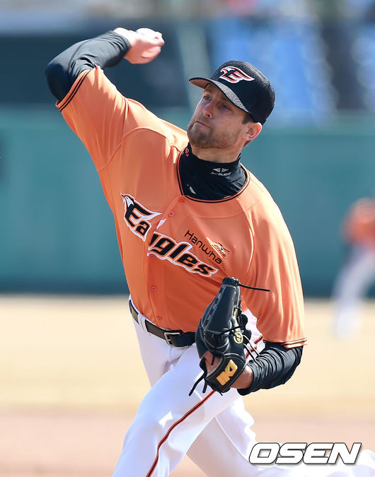 7일 오후 대전 한밭구장에서 열린 ‘2015 타이어뱅크 KBO 리그’ 시범경기 한화 이글스와 LG 트윈스의 경기, 1회초 한화 선발투수 탈보트가 역투하고 있다.