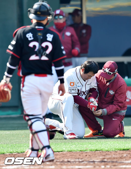 7일 오후 서울 목동구장에서 ‘2015 타이어뱅크 KBO 리그’ 시범경기 넥센 히어로즈와 kt 위즈의 개막전이 열렸다. 4회말 1사 넥센 강지광이 타석에서 kt 선발 필어윈의 볼에 손을 맞고 고통스러워 하고 있다.