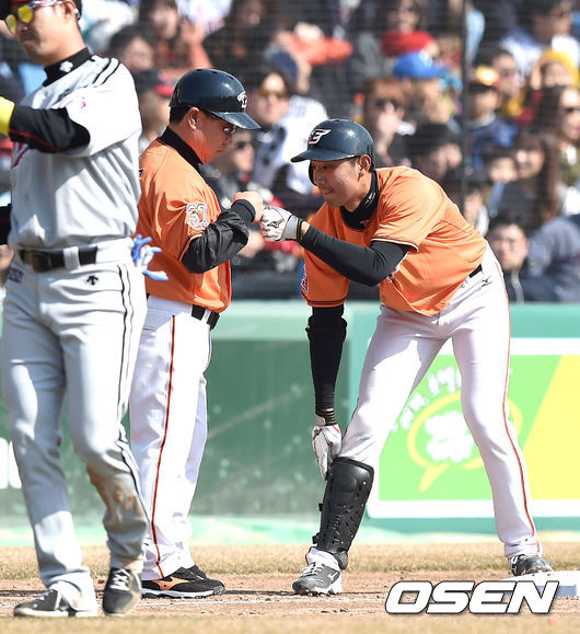 7일 오후 대전 한밭구장에서 열린 ‘2015 타이어뱅크 KBO 리그’ 시범경기 한화 이글스와 LG 트윈스의 경기,3회말 1사 1루 한화 황선일이 1타점 3루타를 날리고 김광수 3루 코치와 하이파이브를 하고 있다.