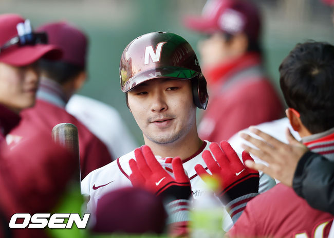 7일 오후 서울 목동구장에서 ‘2015 타이어뱅크 KBO 리그’ 시범경기 넥센 히어로즈와 kt 위즈의 개막전이 열렸다. 5회말 무사 주자 2,3루 넥센 박병호가 중견수 희생플라이를 날려 1타점을 올린 후 덕아웃에서 동료들과 하이파이브를 하고 있다.
