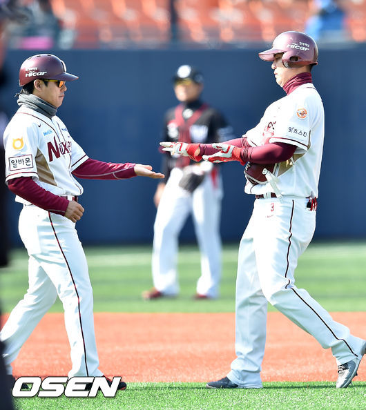 7일 오후 서울 목동구장에서 ‘2015 타이어뱅크 KBO 리그’ 시범경기 넥센 히어로즈와 kt 위즈의 개막전이 열렸다. 5회말 1사 주자 3루 넥센 김민성이 1타점 적시타를 날린 후 2루에서 기뻐하고 있다.