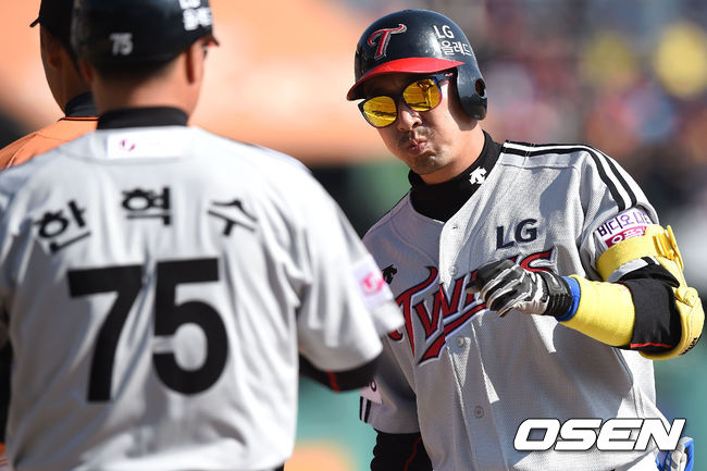 7일 오후 대전 한밭구장에서 열린 ‘2015 타이어뱅크 KBO 리그’ 시범경기 한화 이글스와 LG 트윈스의 경기,5회초 2사 1,2루 LG 정성훈이 1타점 적시타를 날리고 한혁수 코치와 하이파이브를 하고 있다