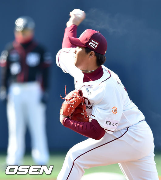 7일 오후 서울 목동구장에서 ‘2015 타이어뱅크 KBO 리그’ 시범경기 넥센 히어로즈와 kt 위즈의 개막전이 열렸다. 8회초 마운드에 오른 넥센 김영민이 힘차게 공을 뿌리고 있다.