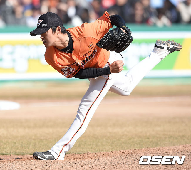 7일 오후 대전 한밭구장에서 열린 ‘2015 타이어뱅크 KBO 리그’ 시범경기 한화 이글스와 LG 트윈스의 경기,56회초 한화 불펜투수 최우석이 역투하고 있다.