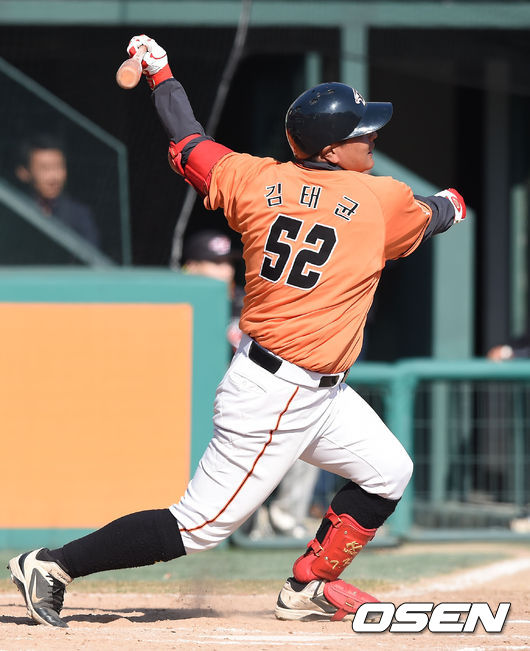 7일 오후 대전 한밭구장에서 열린 ‘2015 타이어뱅크 KBO 리그’ 시범경기 한화 이글스와 LG 트윈스의 경기, 6회말 1사 만루 한화 김태균이 2타점 적시타를 날리고 있다.