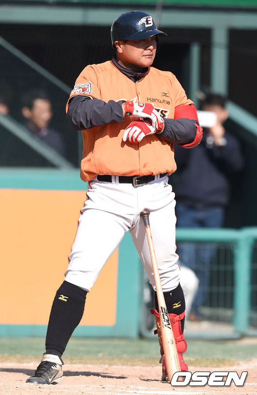 7일 오후 대전 한밭구장에서 열린 ‘2015 타이어뱅크 KBO 리그’ 시범경기 한화 이글스와 LG 트윈스의 경기, 6회말 1사 만루 한화 김태균이 타석에 들어서서 준비를 하고 있다.