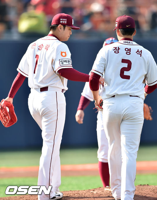 경기를 마치고 넥센 손승락이 장영석과 하이파이브를 하고 있다. / rumi@osen.co.kr