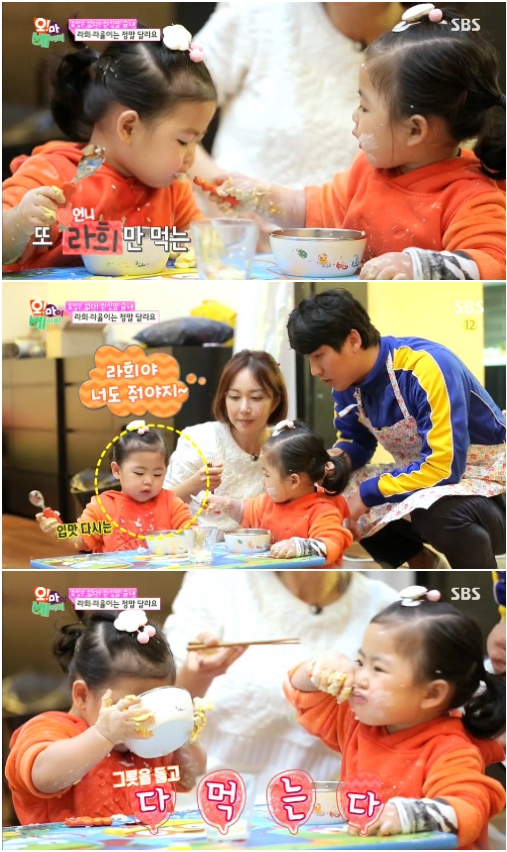 7일 오후 방송된 SBS 예능프로그램 '오!마이 베이비'(이하 오마베)에서는 두 딸과 함께 요리 만들기에 나선 슈 가족의 모습이 그려졌다. 슈와 임효성 부부, 라희, 라율이는 식혜를 먹으며 잠시 휴식을 취했다.