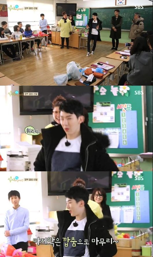 이날 조권은 초등학교를 찾아 졸업을 앞둔 6학년들 앞에서 인사를 건넸다. 반가움의 의미로 조권은 '위 아래' 춤을 선보인 것.