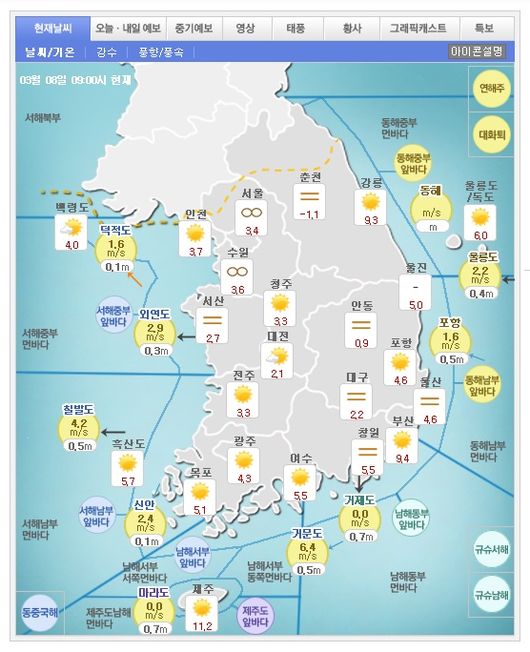 기상청 예보에 따르면 8일은 동해상에 위치한 고기압의 영향을 받다가 점차 그 가장자리에 들겠다. 그러나 제주도는 남서쪽에서 다가오는 기압골의 영향을 점차 받을 전망이다.