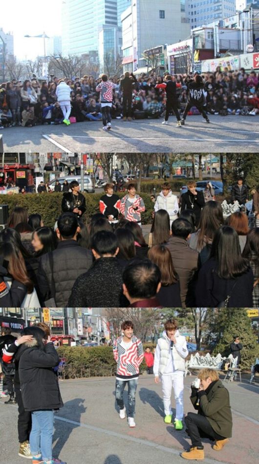 아이돌그룹 JJCC가 서울 홍대를 급습해 게릴라 콘서트를 갖고 팬들과 특별한 시간을 보냈다.