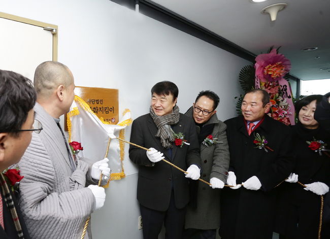 사단법인 '우리문화지킴이'가 지난 해 12월, 광화문에서 서울사무소 개소식 및 현판식을 갖고 있다. 왼쪽이 혜문스님이고 현판 오른쪽이 우리문화지킴이 김상철 회장. / 한글과컴퓨터 제공.