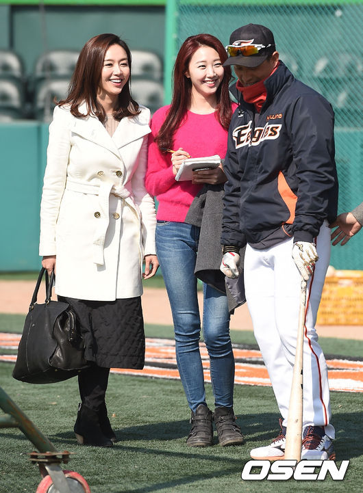 8일 오후 대전 한밭구장에서 열린 ‘2015 타이어뱅크 KBO 리그’ 시범경기 한화 이글스와 LG 트윈스의 경기에 앞서 김민아 아나운서와 김세희 아나운서가 한화 김재현 코치와 인터뷰를 하고 있다.