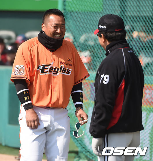 8일 오후 대전 한밭구장에서 열린 ‘2015 타이어뱅크 KBO 리그’ 시범경기 한화 이글스와 LG 트윈스의 경기에 앞서 한화 조인성이 LG 양상문 감독에게 인사를 하고 있다.