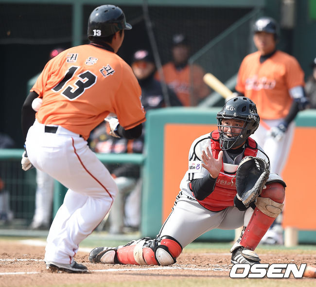8일 오후 대전 한밭구장에서 열린 ‘2015 타이어뱅크 KBO 리그’ 시범경기 한화 이글스와 LG 트윈스의 경기, 1회말 2사 1,3루 한화 김태균의 내야땅볼때 3루 주자 권용관이 LG 정성훈 3루수의 송구에 맞고 홈에 세이프되고 있다.