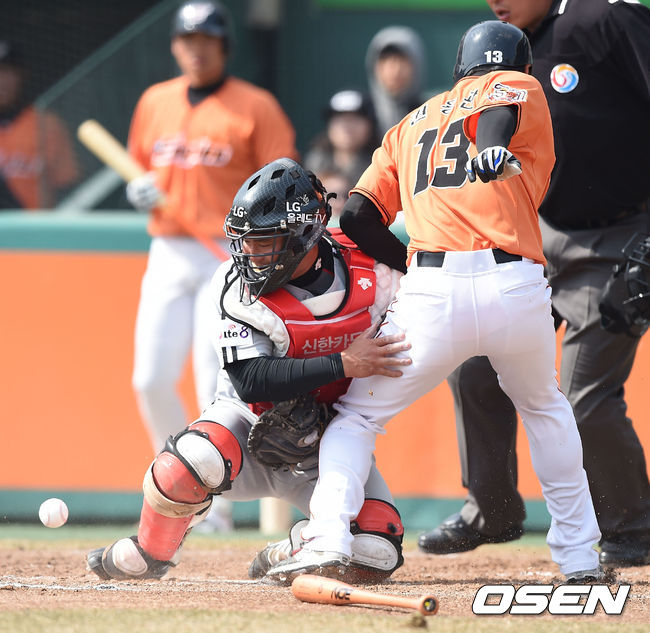 8일 오후 대전 한밭구장에서 열린 ‘2015 타이어뱅크 KBO 리그’ 시범경기 한화 이글스와 LG 트윈스의 경기, 1회말 2사 1,3루 한화 김태균의 내야땅볼때 3루 주자 권용관이 LG 정성훈 3루수의 송구에 맞고 홈에 세이프되고 있다.