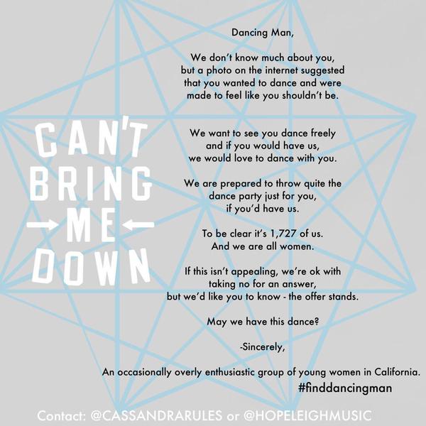 카산드라는 뚱보남에게 "댄싱맨, 우리는 당신에 대해 아는 것이 없습다. 하지만 인터넷에 올라온 한 장의 사진이, 당신이 춤을 추고 싶어 한다는 걸 보여줬다"면서 "1727명이 당신을 위한 댄스 파티를 준비 중이다. 모두 여자이고 초대를 거절해도 괜찮다. 그러나 우리의 초대는 여전히 유효하다. 종종 과하게 열정적이 돼버리는 캘리포니아의 젊은 여성들이"라고 마무리 했다.