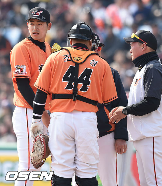 8일 오후 대전 한밭구장에서 열린 ‘2015 타이어뱅크 KBO 리그’ 시범경기 한화 이글스와 LG 트윈스의 경기,4회초 1사 1,2루 한화 선발투수 이태양이 교체되고 있다. 이태양은 이날 3⅓이닝 3실점 기록했다.