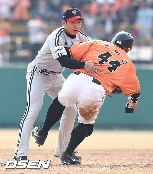 8일 오후 대전 한밭구장에서 열린 ‘2015 타이어뱅크 KBO 리그’ 시범경기 한화 이글스와 LG 트윈스의 경기,4회말 1사 1루 한화 정유철의 삼진아웃때 도루 시도한 1루 주자 조인성이 유격수 오지환에게 아웃되고 있다.