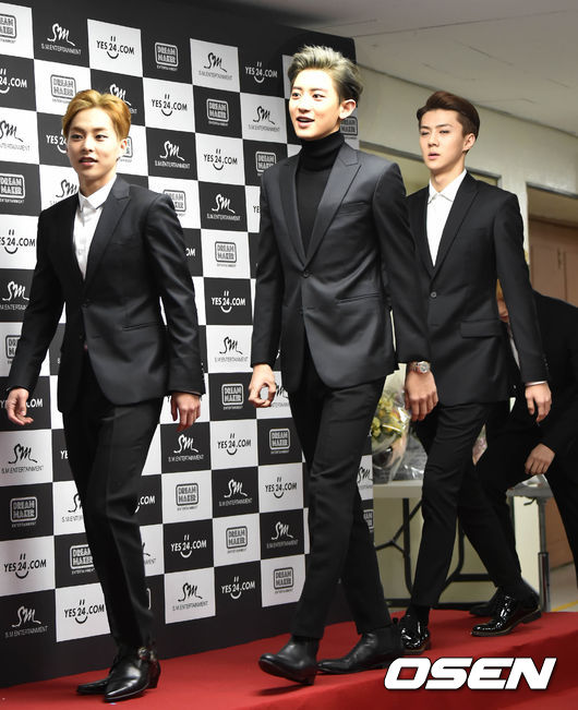 그룹 엑소의 두 번째 단독콘서트가 열리기 전 벌어진 기자회견에서 엑소 찬열이 기자회견장에 입장 하고 있다. 이탈한 크리스, 루한 없는 10인 멤버로서의 콘서트는 이번이 처음이다.