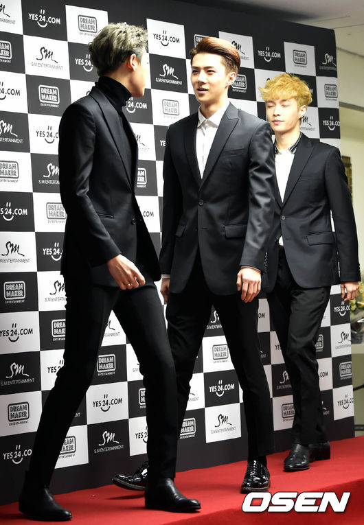 그룹 엑소의 두 번째 단독콘서트가 열리기 전 벌어진 기자회견에서 엑소 찬열과 세훈이 입장 하고 있다. 이탈한 크리스, 루한 없는 10인 멤버로서의 콘서트는 이번이 처음이다.