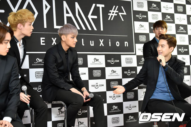 그룹 엑소의 두 번째 단독콘서트가 열리기 전 벌어진 기자회견에서 엑소 수호가 중국 취재진의 질문에 대해 레이와 타오에게 물어보고 있다. 이탈한 크리스, 루한 없는 10인 멤버로서의 콘서트는 이번이 처음이다.