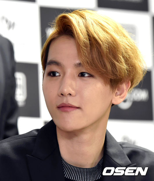 8일 그룹 엑소의 두 번째 단독콘서트가 열리기 전 벌어진 기자회견에서 엑소 백현이 취재진의 질문을 듣고 있다. 이탈한 크리스, 루한 없는 10인 멤버로서의 콘서트는 이번이 처음이다.