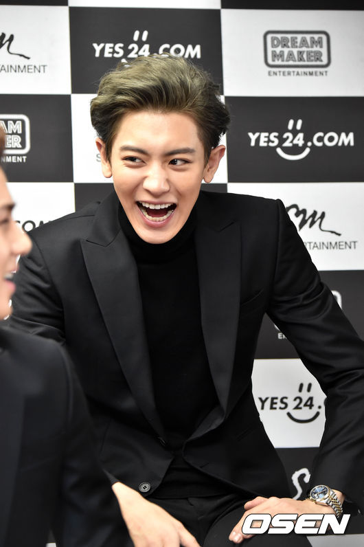 8일 그룹 엑소의 두 번째 단독콘서트가 열리기 전 벌어진 기자회견에서 엑소 찬열이 크게 웃고 있다. 이탈한 크리스, 루한 없는 10인 멤버로서의 콘서트는 이번이 처음이다.