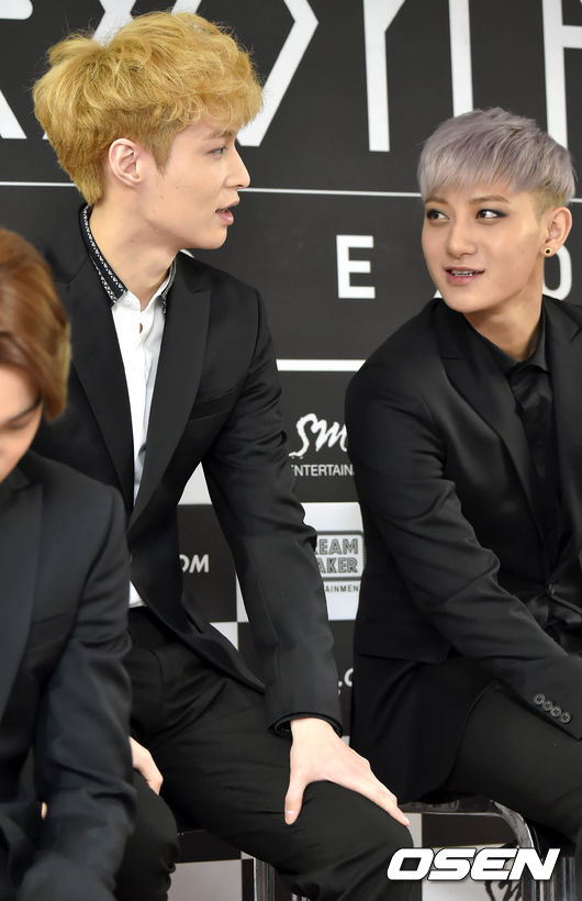 8일 그룹 엑소의 두 번째 단독콘서트가 열리기 전 벌어진 기자회견에서 엑소 레이와 타오가 이야기를 나누고 있다. 이탈한 크리스, 루한 없는 10인 멤버로서의 콘서트는 이번이 처음이다.