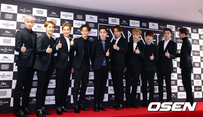 8일 그룹 엑소의 두 번째 단독콘서트가 열리기 전 벌어진 기자회견에서 엑소가 포토타임을 갖고 있다. 이탈한 크리스, 루한 없는 10인 멤버로서의 콘서트는 이번이 처음이다.