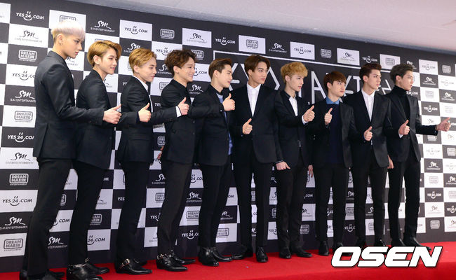 8일 그룹 엑소의 두 번째 단독콘서트가 열리기 전 벌어진 기자회견에서 엑소 멤버들이 포토타임을 갖고 있다. 이탈한 크리스, 루한 없는 10인 멤버로서의 콘서트는 이번이 처음이다.